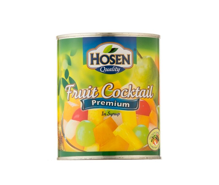 – Hosen Fruit Cocktail in Syrup is a mix of diced fruits like peaches, pears, pineapple, grapes, and cherries, packed in a light syrup.